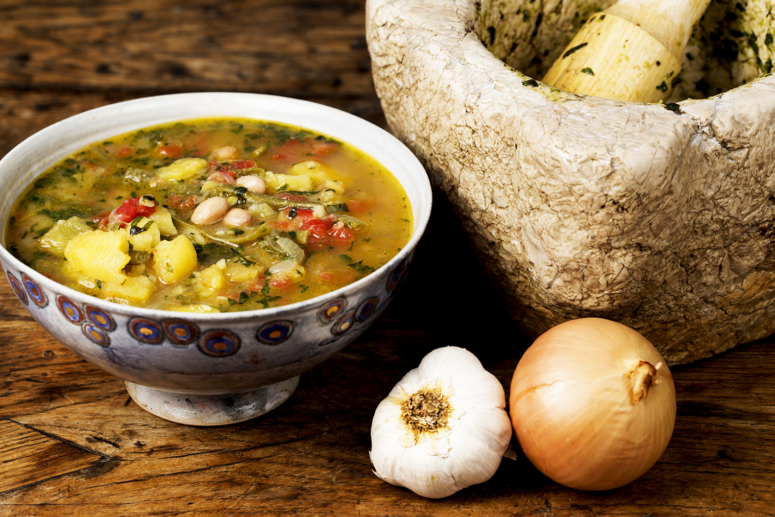 Ingrédients pour 4 personnes : 250g de haricots blancs frais, 250g de haricots rouges frais, 200g de haricots verts, 2 pommes de terre, 2 tomates, 2 courgettes, 1 oignon, 200g de lard, 1 branche de basilic, 4 gousses d’ail, huile d’olive, sel et poivre