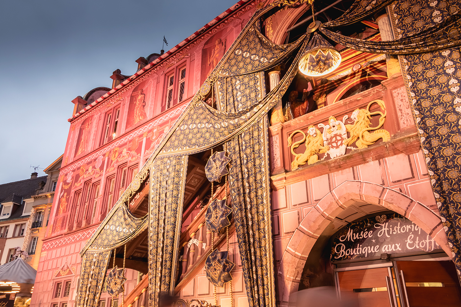 La particularité de Mulhouse et de son marché, c’est que la ville se couvre chaque année d’une étoffe de Noël réalisée pour l’occasion. C’est ainsi que depuis des années l’Hôtel de Ville de Mulhouse ainsi que son marché de Noël sont recouverts d’une étoffe dont les motifs et couleurs changent à chaque édition.