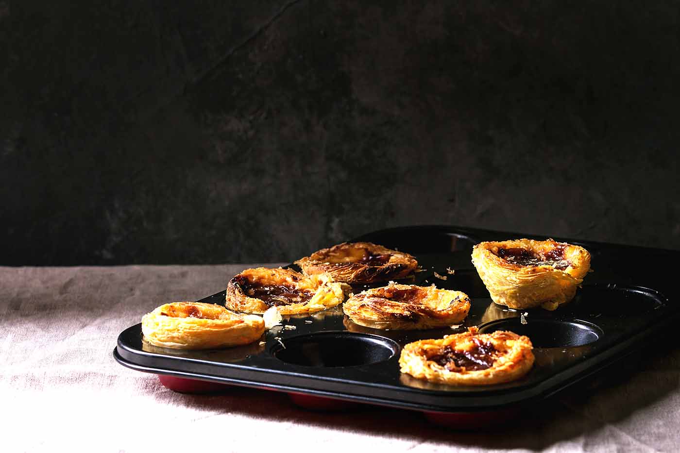 - Déposer une tranche de cette pâte feuilletée dans le fond d’un moule à pastéis (ou à défaut d’un moule à muffins ou à tartelettes)